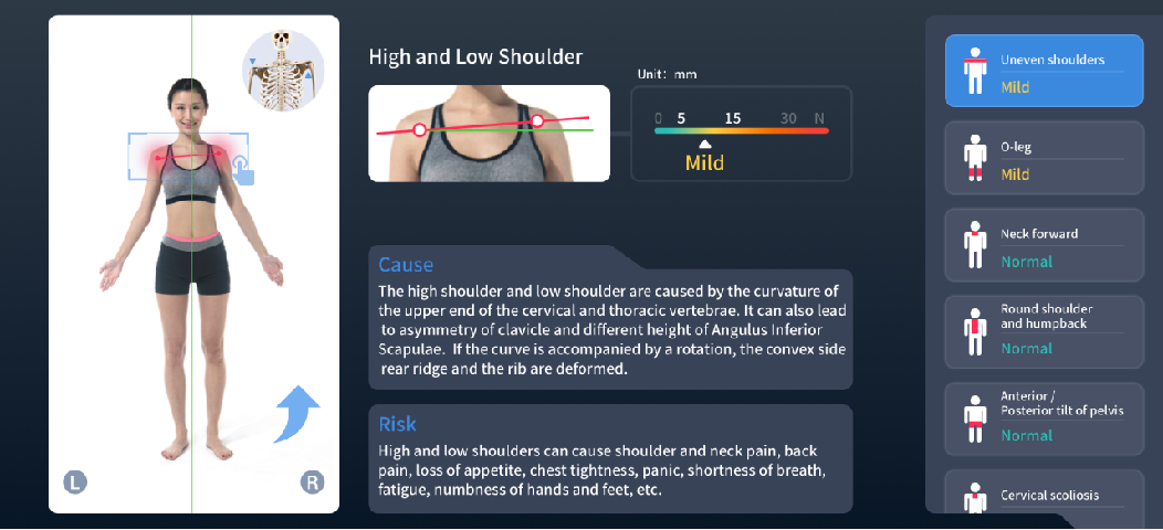 3D sensor capturing technology, based on self-developed visual algorithm and human body model, carries out 3D measurement with millimeter accuracy,checks the body posture fully, predicts the risk of bad posture, realizes the digitalization of measurements, and establishes the standardization of body posture assessment.