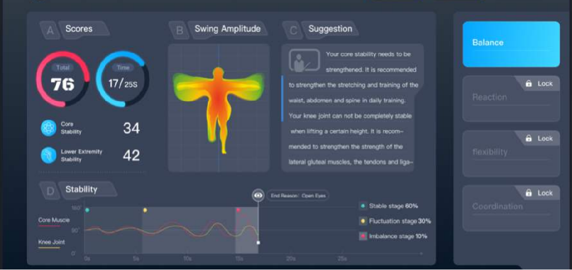 To monitor every movement by AI, and adopting self-developed dynamic evaluation system, combining with the most advanced artificial intelligence technologies such as computer version and deep learning neutral network model. Capturing the action behavior of body tester.The movement ability of the body tester, and the risk of movement is prevented. At the same time, excellent human-computer interaction can bring better measurement experience for testers.