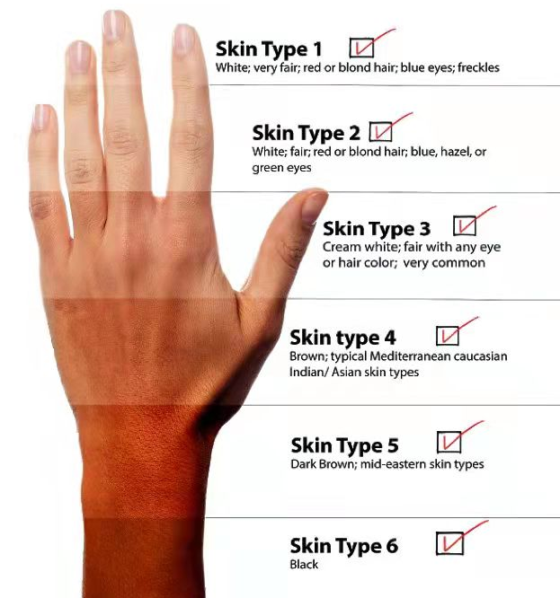 It is generally believed that European and American people have less melanin content in the basal layer of skin, and the skin belongs to types I and II; yellow skin in Southeast Asia is type III, IV, and the content of melanin in the basal layer of the skin is moderate; African brown-black skin is type V, VI, and the content of melanin in the basal layer of the skin is very high.
