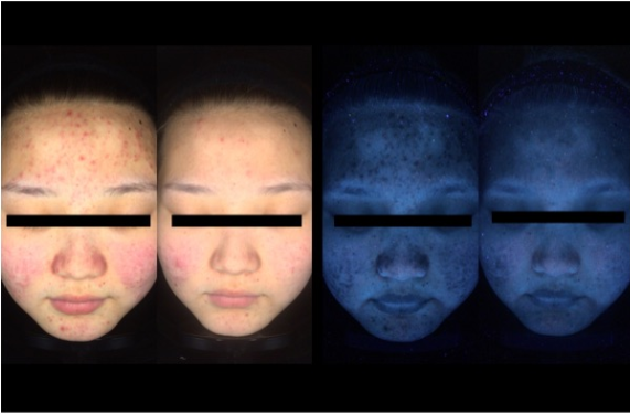 The brick-red fluorescent dots seen in UV light mode are porphyrins, metabolites of Acinetobacter. Acinetobacter is the main bacteria responsible for acne. See the blue fluorescent dots, that’s Botrytis cinerea, which causes the skin to trigger folliculitis. Under the original image you can clearly see a significant reduction in the number of pimples. Under the sensitive mode, you can see: the redness and swelling of the pimples have flattened down, the inflammation reaction is under control, and the redness and swelling area has shrunk.Under the UV light, you can see: the black pimple marks were all over the whole face before the treatment, and after the treatment, the pimple marks became lighter, and there are a few locations where you can hardly see any pimple marks, which means that the treatment has been very effective.